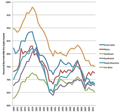 Discussion of the decline of Metro Area Equity from the 1970s onward. This greatly affects metro area real estate pricing and affordability. Why the Economic Fates of American Cities Diverged - The Atlantic.